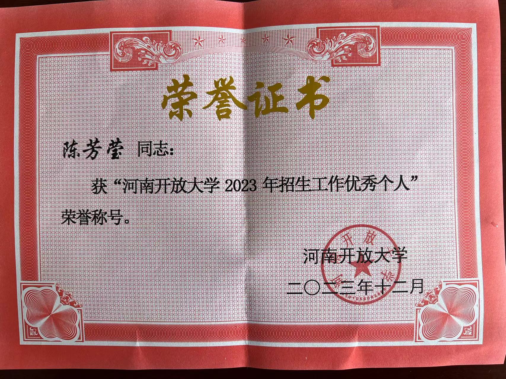 2024年3月15日,在许昌市鄢陵县开展河南开放大学系统建设工作暨2024年春季招生工作推进活动。活动期间对2023年度招生工作先进集体和优秀个人进行了表彰。老太阳集团8722武陟分校荣获“河南开放大学2023年度招生工作先进集体”,贺黎明(市校直属)、陈芳莹(武陟分校)荣获“河南开放大学2023年度招生工作先进个人”。
