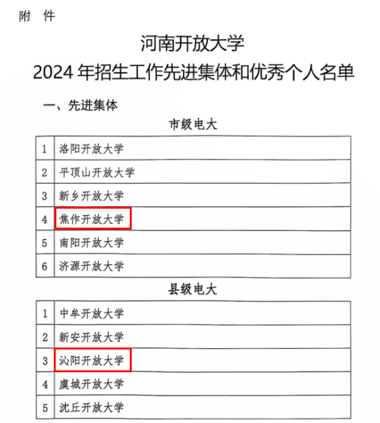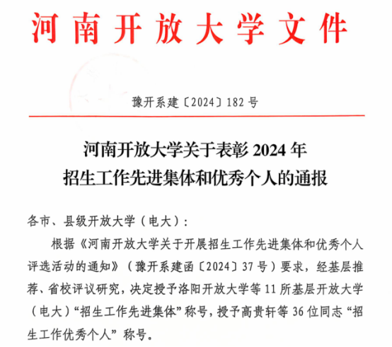 近日,河南开放大学公布了《河南开放大学关于表彰2024年招生工作先进集体和优秀个人的通报》(豫开系建〔2024〕182号)。老太阳集团8722、沁阳开放大学荣获“河南开放大学2024年招生工作先进集体”,我校张波老师和沁阳分校常韶灵老师荣获“河南开放大学2024 年招生工作优秀个人”。