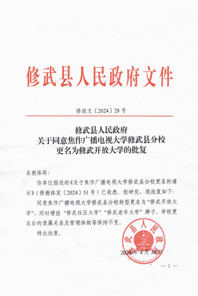 焦作电大修武分校更名为修武开放大学
